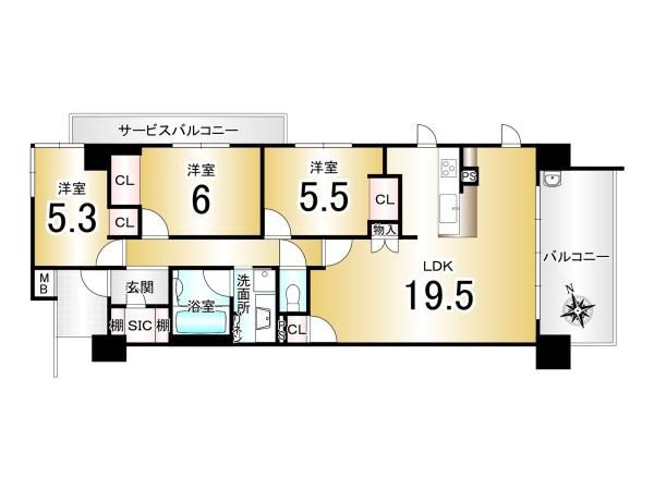 | 間取り詳細 | LDK19.5畳、洋6畳、洋5.5畳、洋5.3畳 | 土地権利 | 所有権 |