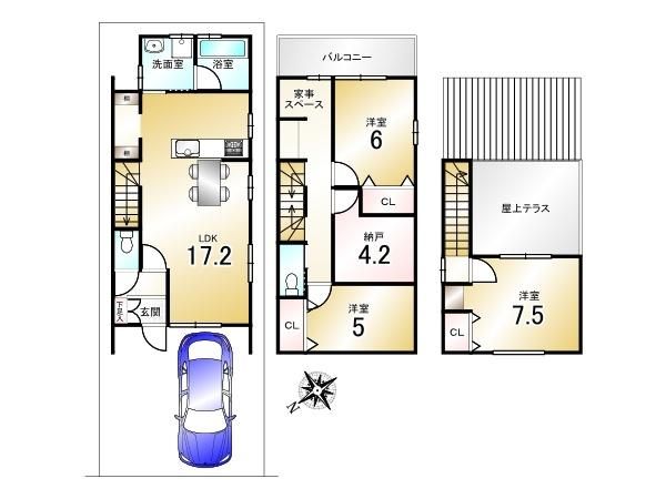 間取り詳細 | LDK17.2畳(1F)、洋6畳(2F)、洋5畳(2F)、S4.2畳(2F)、洋7.5畳(3F) | 都市計画 | 市街化区域 |