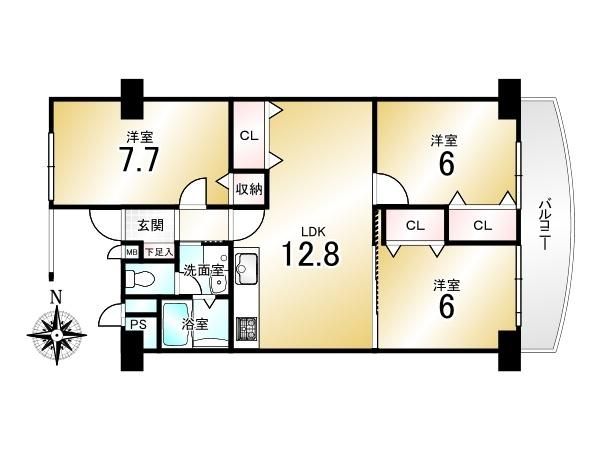 | 間取り詳細 | LDK12.8畳、洋7.7畳、洋6畳、和6畳 | 土地権利 | 所有権 |