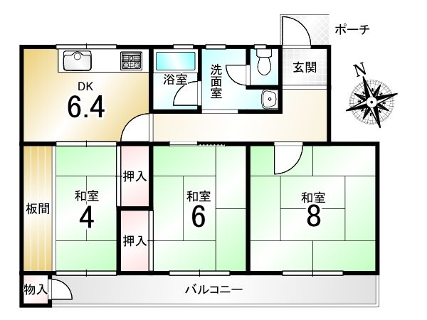 | 間取り詳細 | 和8畳、和6畳、和4畳、DK6.4畳 | 土地権利 | 所有権 |