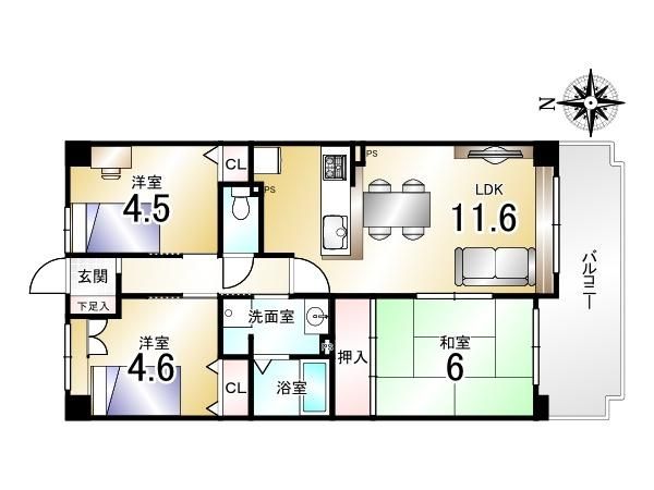 | 間取り詳細 | LDK11.6畳、和6畳、洋4.6畳、洋4.5畳 | 土地権利 | 所有権 |