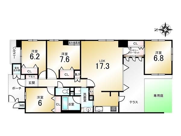 | 間取り詳細 | LDK17.3畳、洋7.6畳、洋6.8畳、洋6.2畳、洋6畳 | 土地権利 | 所有権 |