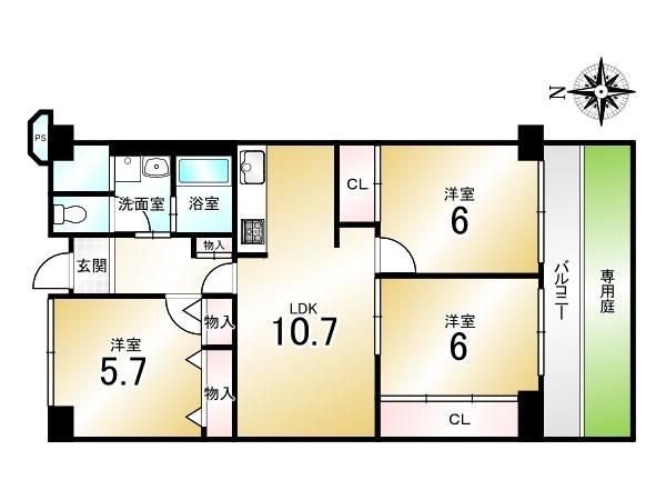 | 間取り詳細 | LDK10.7畳、洋6畳、洋6畳、洋5.7畳 | 土地権利 | 所有権 |